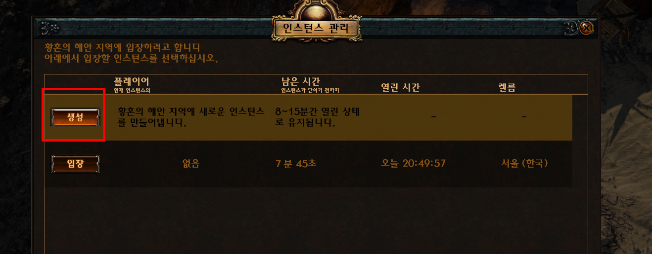 그러면 위와같이 인스턴트 관리라는 창이 하나 뜨는데요. 보시면 제가 앞서 입장한 맵이 있구요. 그위로 생성이라는 버튼이 있습니다. 이것을 클릭해주시면 기존 맵과는 다른 새로운 맵이 열리게 됩니다.