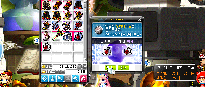 여기서 중요한 팁을 하나 알려드릴게요. 앞서 대량으로 구입한 장비들을 절대 버리지 마시구요. 착용하고난 마이스터빌에가서 같은 아이템 종류를 합성해주세요. 그러면 두개를 소비해서 하나를 만들 수 있으니 메소를 아낄 수 있습니다.