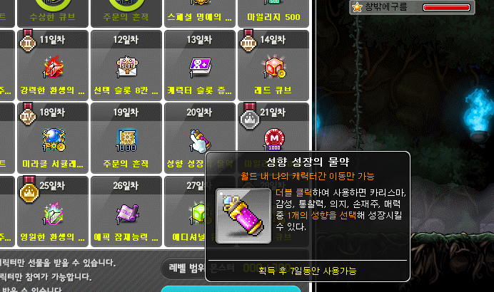 매력을 올려주는 가장 좋은 방법중 하나가 바로 성향 성장의 물약입니다. 하지만 데일리기프트로 가끔 얻을 수 있거나 이벤트 코인상점에서나 구할 수 있기때문에 사실상 성향성장의비약만으로는 매력30레벨 달성은 어려운데요.