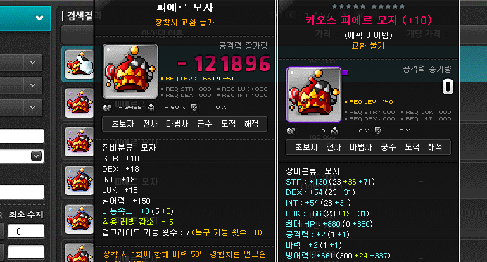 메이플 매력 올리는 아이템을 경매장에서 대량으로 구입하여 착용해주시는 방법이 가장 좋은데요. 가격도 저렴하고 매력점수도 올려주는 아이템을 적어보도록 하겠습니다. 먼저 루타비스 모자 종류인데요. 그 목록에는 [피에르모자] [반반투가] [퀸의 티아라] [벨룸의 헬름] 이렇게 4종류에다가 접두어로 카오스가 붙어있는 경우까지 합하면 총 8종류입니다. 카오스를 제외하고 4종류를 보면 대략 15~30만메소 사이에 구입하여 매력 50을 올릴 수 있죠.