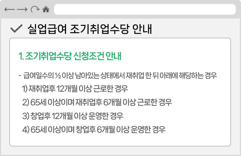 다만 앞선 조건에 해당하더라도 이전에 퇴사했던 직장에 다시 취업하거나 공무원 또는 군인과 같이 국가공무직에 취업하는 경우, 월 574만원 이상의 고소득자, 최근 2년내 조기취업수당을 받은 이력이 있다면 제외되니 참고해주시길 바랍니다.